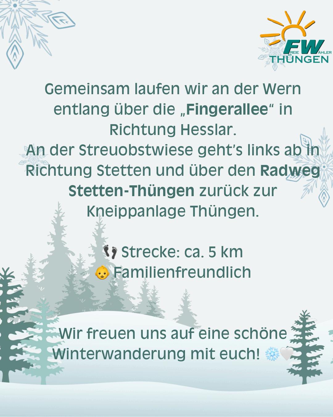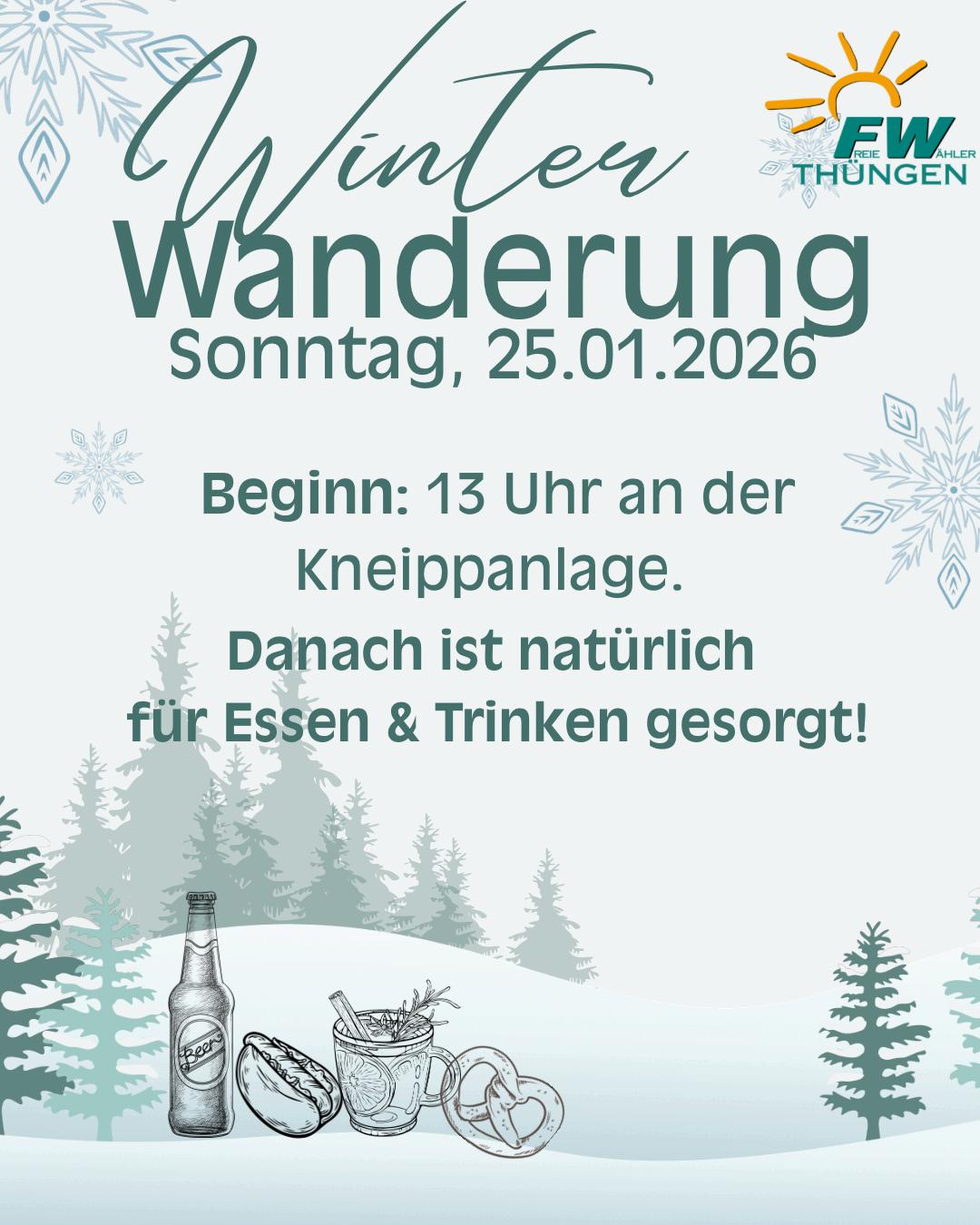 Zu einer Winterwanderung mit anschließender „Stärkung“ laden die „Freien Wähler Thüngen“ ein. Um 13 Uhr soll es an der Kneippanlage (Hauptstraße 19) losgehen. Die Route wird abhängig von der Witterung sein. Ein wenig Kondition und gute Schuhe sind Voraussetzung für die Teilnahme. Lernen Sie bei oder nach der Wanderung die Freien Wähler bei einer Grillwurst und heißen oder kühlen Getränken kennen. Nach der Wanderung ist eine Zusammenkunft mit Stärkung neben der Kneippanlage an den Feuertonnen vorgesehen. Landratskandidat Christoph Vogel sowie die Kandidatinnen und Kandidaten für den Gemeinderat und Kreistag wollen sich kurz vorstellen. Selbstverständlich werden während und nach der Wanderung auch Gespräche möglich sein. Das Ende ist für 18 Uhr vorgesehen. Aufgrund der Wetterlage könnten sich kurzfristige Änderungen ergeben.